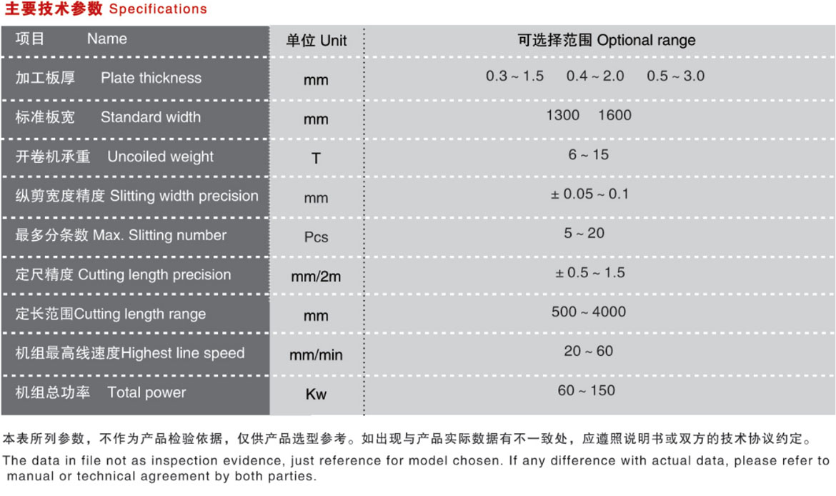 由上料小車、開卷機、引頭裝置、牽引夾送及校平、緩沖活套、對中裝置、定長送料-縱剪主機、剪板機、輸送出料、落料裝置等組成。