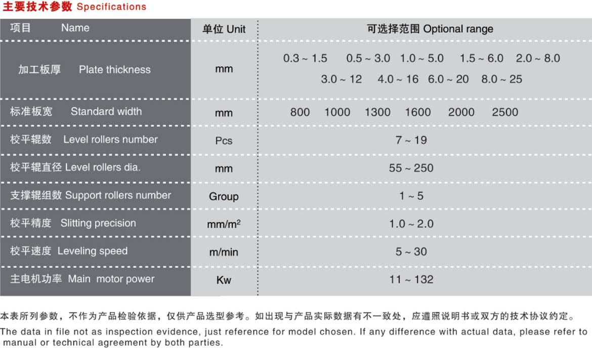 性能特點: 本機床為輥式金屬板料整平專用設備,通常由動力、主機和電器控制等部分組成。利用多輥工作原理,使板料在上、下校平輥之間反復變形,消除應力,達到校平的目的。在上、下排工作輥外側,設剛性支撐輥(輪),構成四重式組輥結構。板料通過本機校平,可明顯改善其平整狀態,提高工件的質量。可獨立工作,用于單塊板材的校平;亦可在本機前配置開卷、引料,后面配置剪切、垛料及聯機機構等,通過控制系統連成性能完備的生產線,對金屬卷材進行整平、分切。