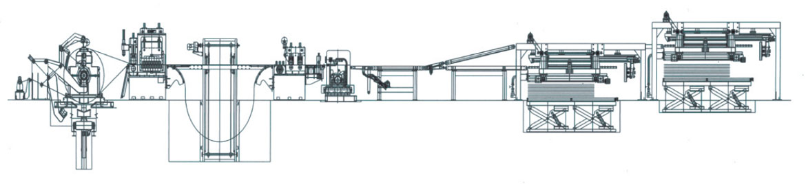 性能特點: 該生產線是將較薄金屬卷板整平、剪切成塊狀板材的專用設備,實現工件連續運行不停的工況下,完成高速精確定長剪切,工件平整度及板型好,特別適合于剪切短板工件的批量生產。 通常由上料小車、開卷機、引頭裝置、校平主機、活動過橋、導向糾偏裝置、定尺機構、覆膜裝置、飛剪主機、輸送工作臺、氣動排料架、液壓升降垛料臺、運料滾道臺及液壓、氣動及電氣控制系統等組成。 主要液壓、氣動、電控元件、定尺飛剪控制系統均選用國際一線品牌,操作界面友好,可靠性高。